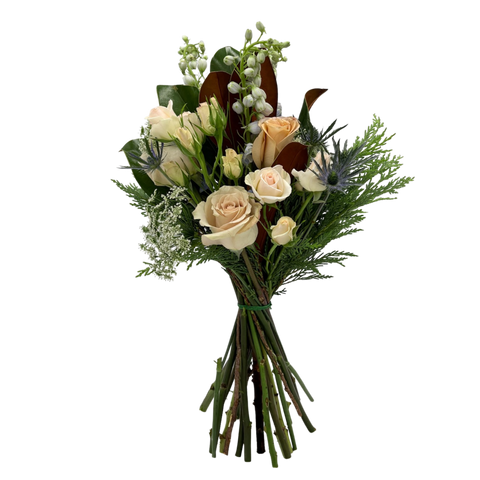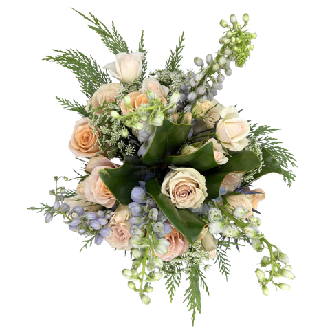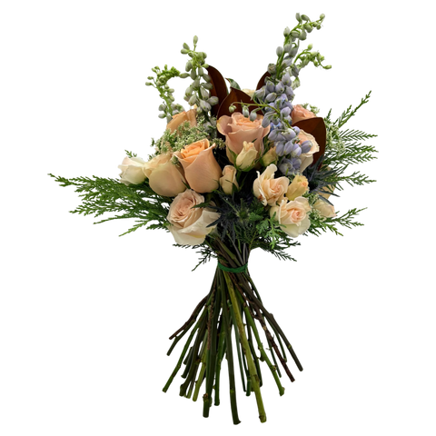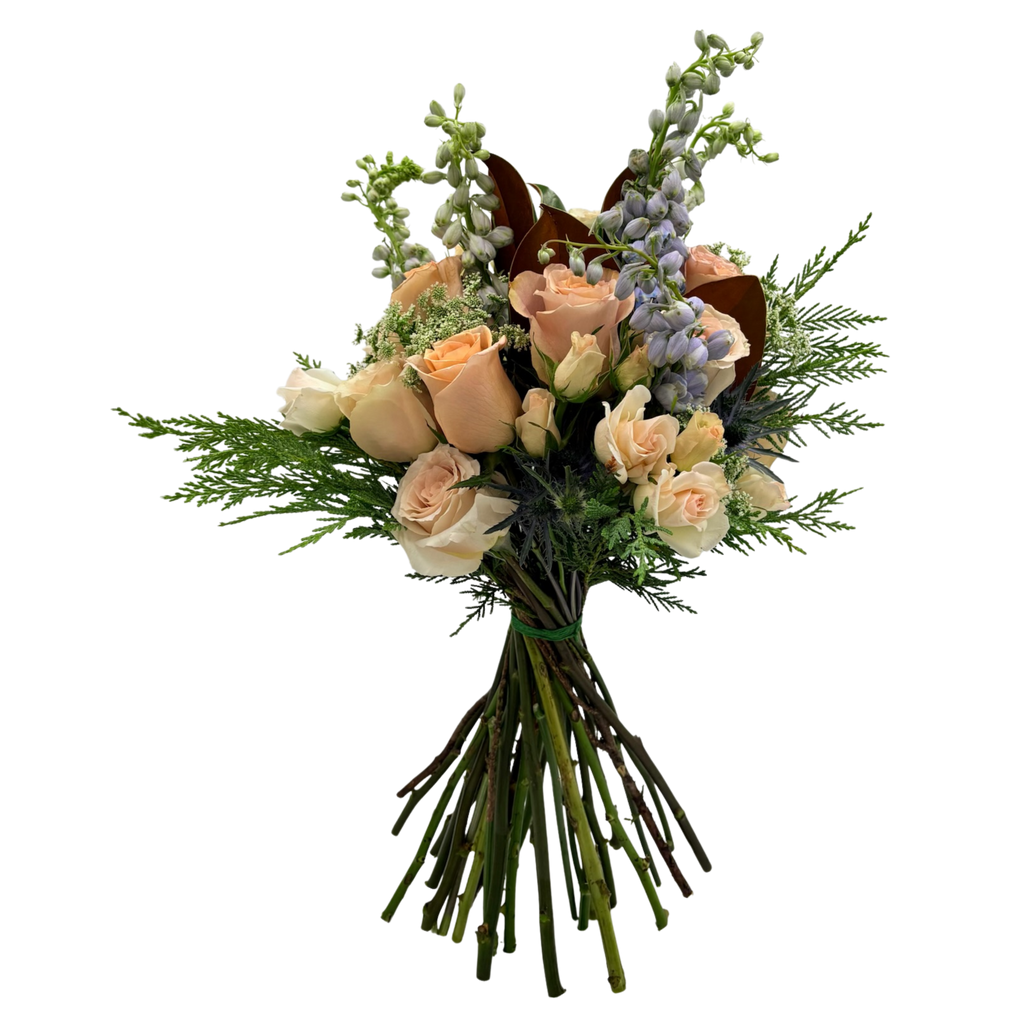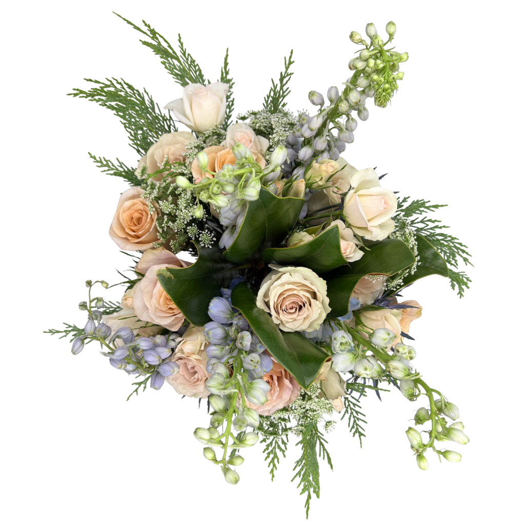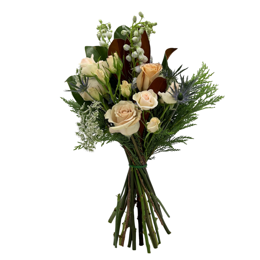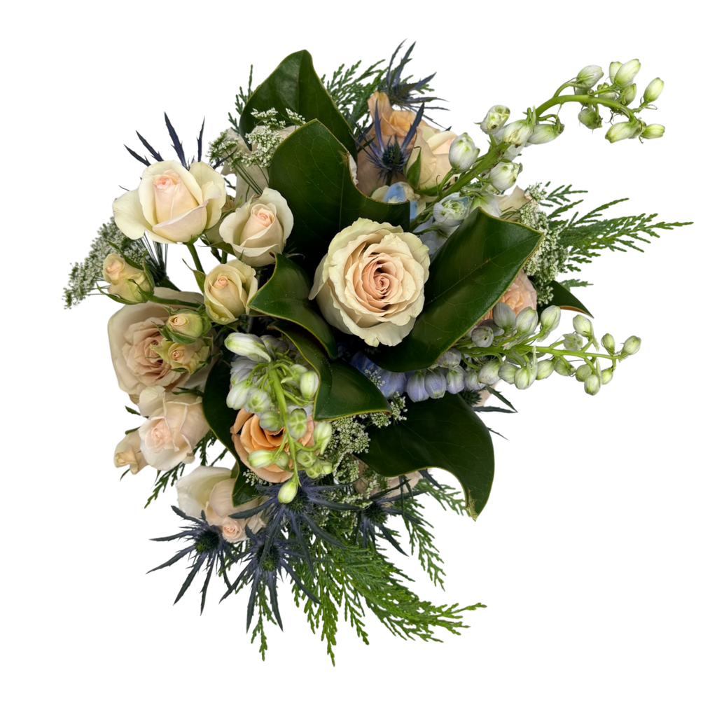 Featuring toffee and neutral roses, cream spray roses, blue thistle, blue delphinium, queen anne’s lace, magnolia foliage, and premium Christmas greens, Blue Ember captures the beauty of winter’s contrast — warm textures glowing against crisp, frosty tones. Thoughtfully arranged to highlight depth, movement, and color balance, each bouquet feels both modern and timeless.