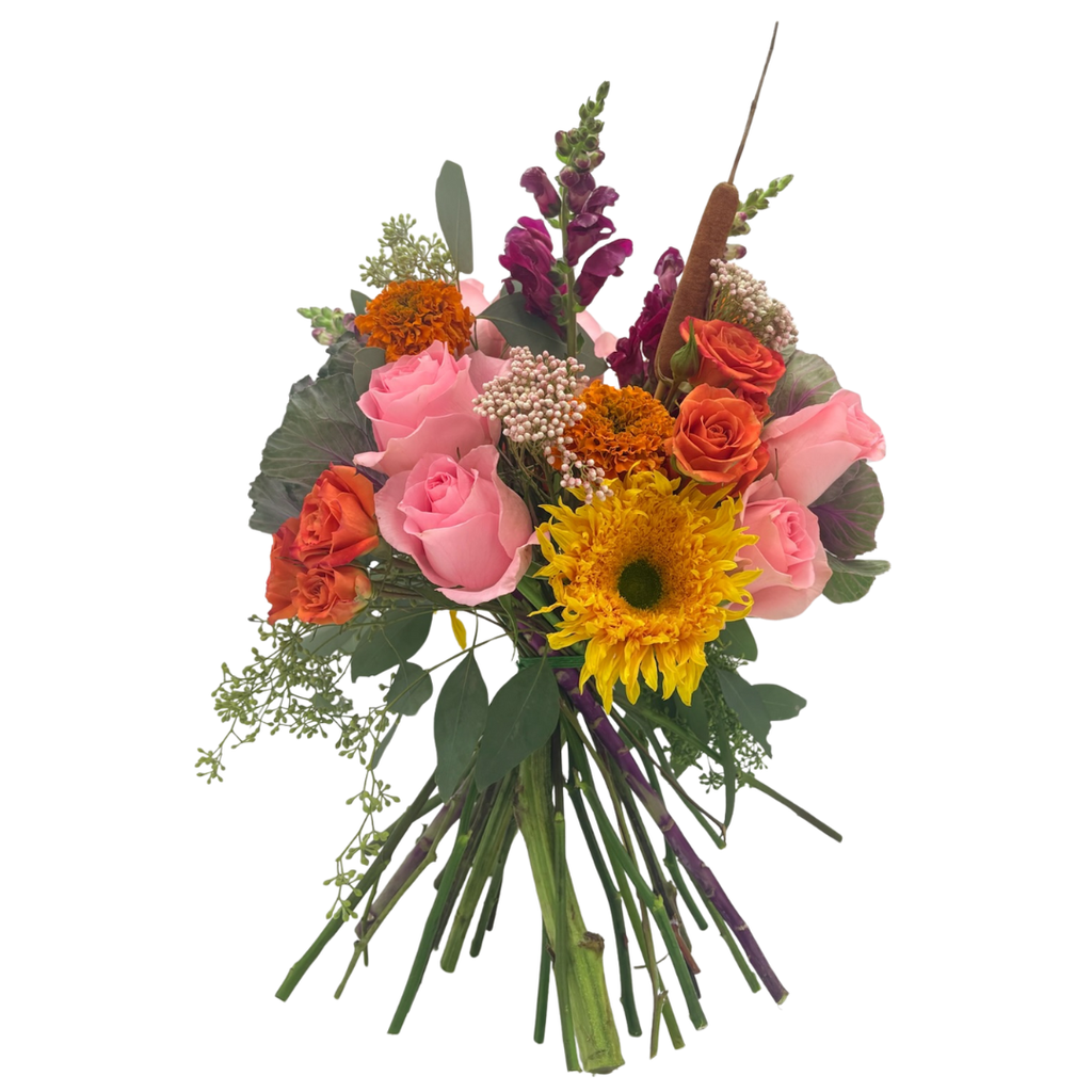 Celebrate October birthdays with bold, vibrant color and texture! This month’s hand-tied bouquet features rich orange marigolds, purple snapdragons, pink roses, sunflowers, kale, and lush seasonal greenery. A perfect reflection of autumn’s golden glow and cozy charm. Each stem is carefully arranged to create a joyful, garden-inspired bouquet that captures the warmth and spirit of fall birthdays.