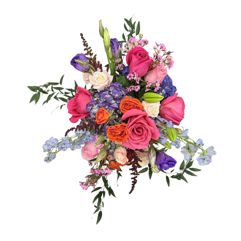 This Mother’s Day bouquet features a beautiful mix of hot pink and blush roses, purple astilbe, orange and light pink spray roses, purple hydrangea, pink waxflower, blue delphinium, lisianthus, and pink lilies, creating a full and colorful arrangement that feels lively and elegant.